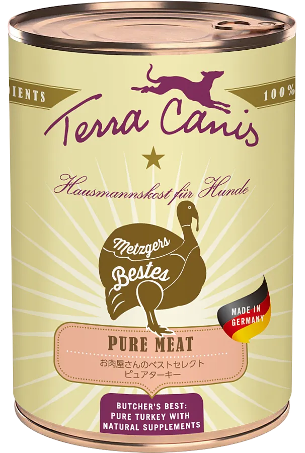 バイエルンのお肉屋さんが厳選した新鮮なターキーのお肉97%に天然亜麻仁油・海藻等を加えています。生肉の代わり、手づくりご飯、トッピングに。保存性にも優れた使いやすいお肉の缶です。 容量400g 生産地 ドイツ サイズ ウェット 素材 七面鳥の心臓(78%)、七面鳥のレバー(11%)、七面鳥の筋肉(8%)、オイスターシェル*、ミネラルクレイ*、ビール酵母*、亜麻仁油、海藻* 成分表 租タンパク質/11.30%租脂肪/3.90%租繊維/0.10%租灰分/1.50%水分/82.40%カロリー100g/Kcal/76.5